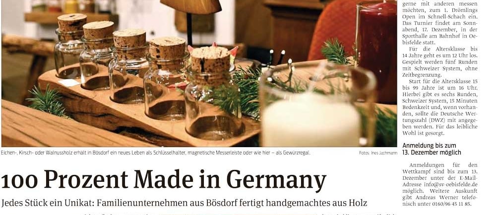 Alle Produkte aus der Bösdorfer Werkstatt seien in Deutschland hergestellt, betont Simon. Nicht nur das Holz, sondern auch die Gläser für das Gewürzregal oder die Verschlusskorken. Darauf legt das Paar viel Wert. Ebenso auf Nachhaltigkeit. Das Holz, das teilweise über einhundert Jahre alt ist, stammt aus heimischen Wäldern oder aus den Abriss alter Häuser. „Wir fällen keine Bäume für unsere Produkte. Oft bekommen wir durch Stürme umgeknickte Bäume, die wir dann selbst in kleine Stücke zersägen und anschließend das Holz trocknen.“ Mit der Gründung der Firma Schwalbenzeit erfüllt sich nun ein großer Traum. „Eine eigene Firma hatte ich ja schon mit meiner Agentur. Doch das bezieht sich rein auf Dienstleistung. Ich wollte jedoch schon immer ein eigenes Produkt herstellen“, erzählt Simon.